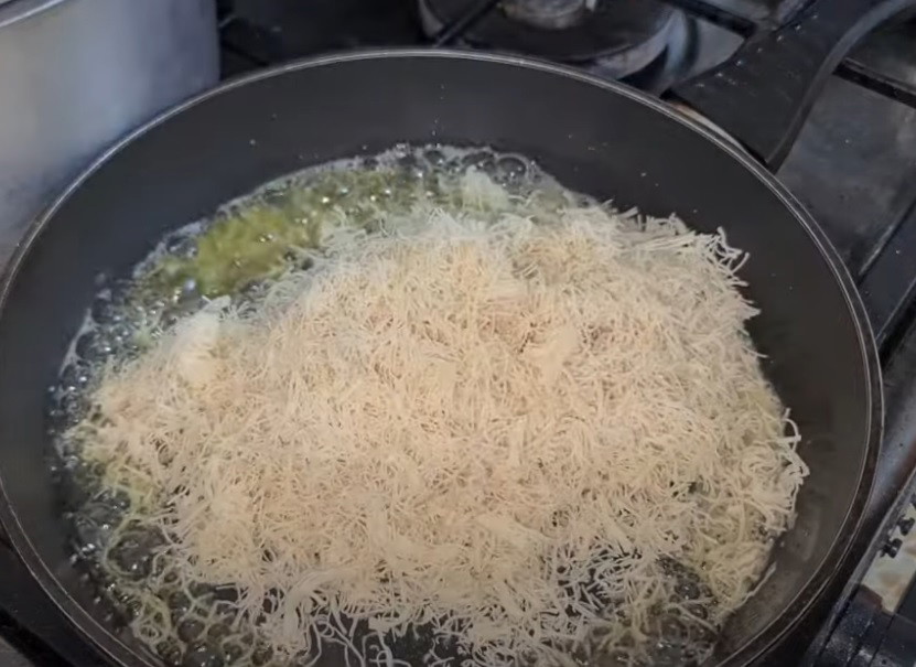 تحضير الكنافة: ابدأ بتحضير ربع كيلو من الكنافة المفرومة والمحمرة في السمنة أو الزبدة حتى تصبح ذهبية ومقرمشة.