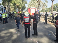 بيان صادر عن المتحدث الرسمي باسم شرطة إسرائيل للإعلام العربي: هذا الصباح قرب الساعة 10:00 تلقى مركز الشرطة بلاغ عن شاحنة التي إصطدمت في حافلة نقل مرورية قرب القاعدة العسكرية جليلوت في منطقة رمات هشارون.قوات معززة من الشرطة وصلت الى المكان بسرعة وشرعت بإغلاق المكان وجمع البينات والأدلة. من فحص أولي تبين وفق الشبهات ان حافلة التي سافرت قرب القاعدة العسكرية جليلوت من الشمال نحو الجنوب، فإنحرفت عن مسارها وإصطدمت في حافلة لنقل الركاب وبمواطنين الذين انتظروا في المكان.إثر إصطدامها أصيب 40 مواطن بدرجات إصابة متفاوتة منها الإصابات الصعبة. تمت إحالة المصابين الى المراكز الطبية على يد طواقم نجمة داود الحمراء. في إطار التقييم للوضع الميداني الذي عقده المفوض العام لشرطة إسرائيل المفتش داني ليفي في المكان مع قائد لواء تل ابيب اللواء حاييم سارجروف تبين ان سائق الشاحنة من سكان دولة اسرائيل حيث تم تحييده بواسطة إطلاق النار على يد مواطن الذي مكث في المكان. كيف ذكرنا، التحقيق في القضية أسند الى الوحدة المركزية في لواء تل ابيب وشمل كافة إتجاهات التحقيق بالتركيز على الشبهات لهجوم ارهابي.في هذه الأثناء تواصل قوات معززة من الشرطة بانتشارها المكثف لتعزيز شعور المواطنين بالامان ويعملون على جمع مواد البينات والأدلة من المكان بما في ذلك جباية الإفادات وجمع توثيقات من المكان".