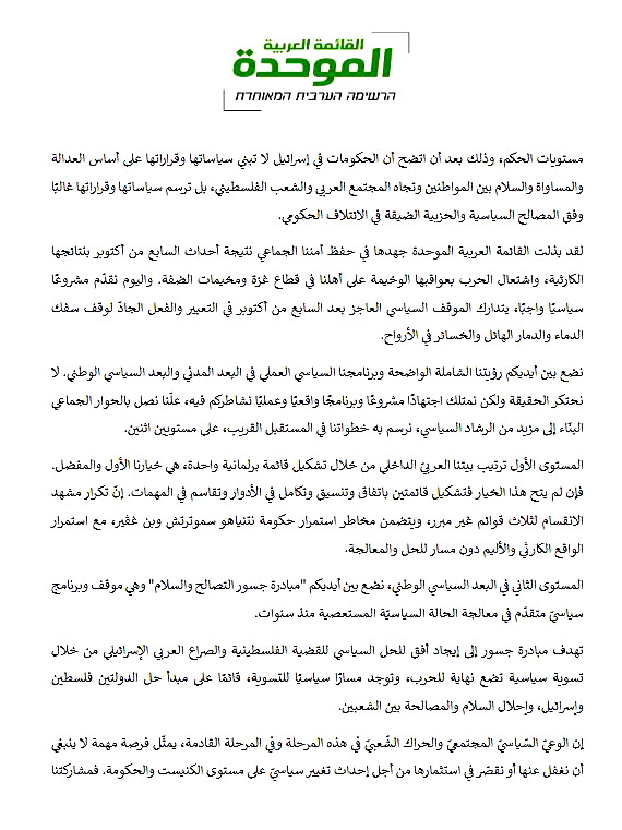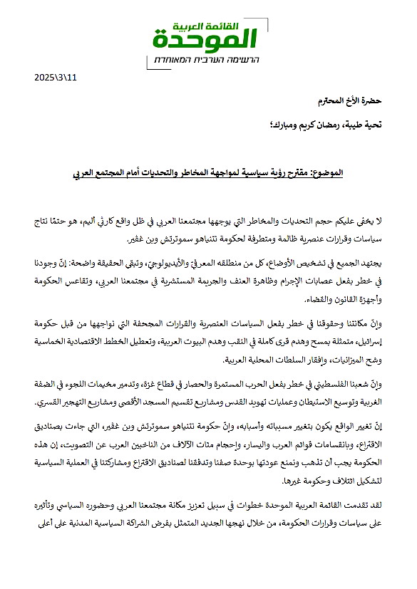 وجّهت القائمة العربية الموحدة رسالة للأحزاب العربية ولرؤساء السلطات المحلية العربية تتضمن مقترحًا عمليًا قدّمت فيه رؤية سياسية شاملة لمواجهة المخاطر والتحدّيات التي يواجهها المجتمع العربي، والشعب الفلسطيني، نتيجة السياسات والقرارات العنصرية لحكومة نتنياهو سموترتش وبن غڤير.