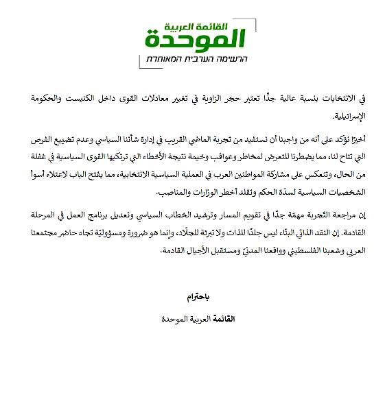 ودعت الموحدة في رسالتها لترتيب البيت الداخلي عبر التنسيق النضالي الميداني، وعبر تشكيل قائمة برلمانية واحدة، وتعاون وتنسيق وتكامل وتقاسم في الأدوار بين الأحزاب إن اختلفت اجتهاداتها، محذرة من مخاطر استمرار الانقسام وتأثيره على مستقبل المجتمع العربي، وعلى استمرار هذه الحكومة المتطرفة في السلطة.
