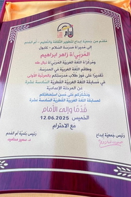 ففي يوم الخميس الموافق 18/9/2025 وسط اجواء من الفخر والاعتزاز قامت ادارة واسرة اعدادية السلام الشاملة - كابول بتكريم طلابها ونجومها المتفوقين والمتميزين ، الذين حصلوا على المراتب الاولى والمتقدمة ( قطريا ومدرسيا ) في مسابقة اللغة العربية للعام الدرلسي 2025 التي تنظمها جمعية ابداع - ام الفحم.