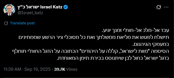 وجه وزير الدفاع الإسرائيلي يسرائيل كاتس، اليوم الجمعة، تهديدا صريحا لزعيم جماعة الحوثي، عبد الملك الحوثي، وقال كاتس موجها كلامه لعبد الملك "سيأتي دورك".