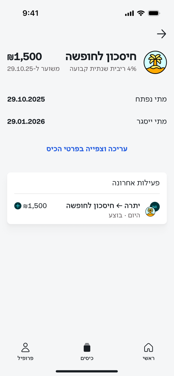 الآن، يتيح تطبيق Bit لأول مرة لزبائنه إيداع الأموال في جيوب ادخار بفائدة ضمن ودائع مخصّصة. في هذه المرحلة، يمكن إيداع الأموال في وديعة بنسبة فائدة سنوية ثابتة تبلغ 4% لمدة ثلاثة أشهر دون إمكانية سحب خلال هذه الفترة.