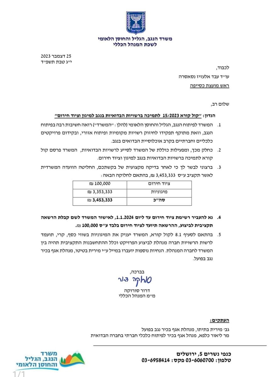 في ظل استمرار الحرب على غزة، والرشقات الصاروخية المستمرة بعد نحو ثلاثة أشهر، حصل المجلس المحلي كسيفة في النقب، على ميزانية ضمن نداء، تقدر بـ3.5 مليون شيكل من وزارة الضواحي والنقب والجليل، لبناء الملاجئ والغرف المحصنة والملاذات الآمنة، لحماية المواطنين والطلاب في البلدة.
