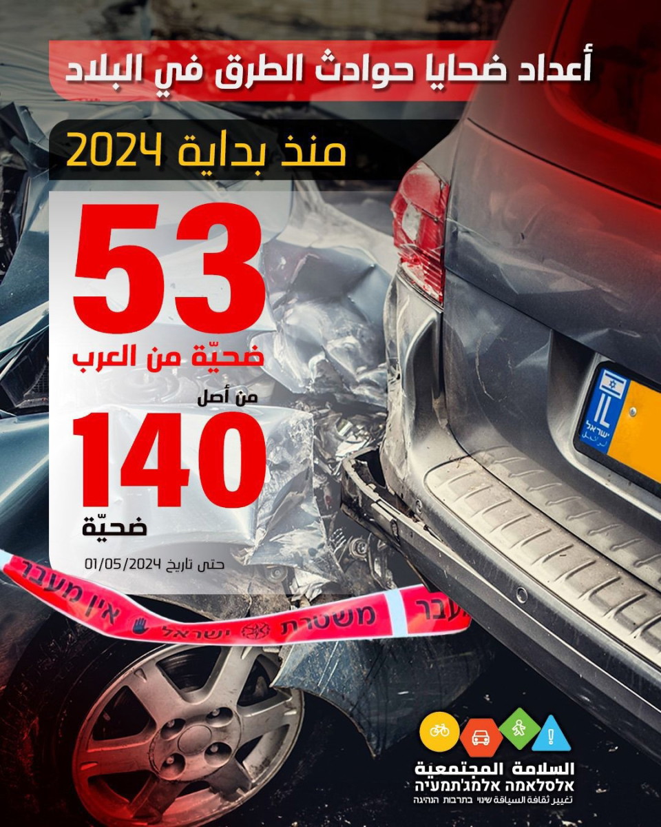جمعية السلامة المجتمعية: عدد ضحايا حوادث الطرق العرب 53 من أصل 140 ضحية في البلاد منذ مطلع العام