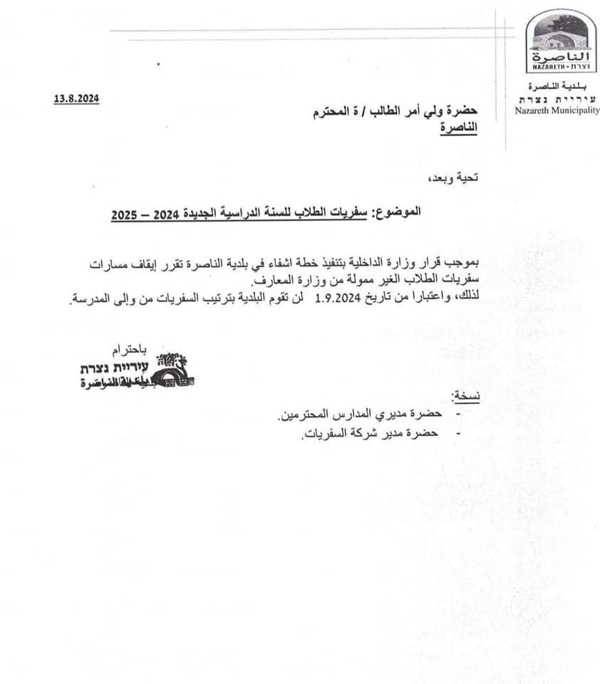 ووصل بيان صادر عن حسني زعبي مندوب الناصرة في لجنة أولياء الأمور القطرية وممثل اللجان في الناصرة جاء فيه: "ندعو البلدية وادارتها في إيجاد حل لسفريات الطلاب التي تم إلغائها من قبل البلدية بحجة خطة الاستشفاء وعليه نطالب بحل بديل للسفريات مثل خط سفريات عمومية تربط المدراس والاحياء بشكل مباشر دون الحاجة إلى التنقل في أكثر من باص لكي يصلون الطلاب الى المدرسة بأمان وأسرع، وعليه اذ لم يكن هناك بديل فإننا سوف نعلن عن الإضراب المفتوح ولن نرسل أولادنا إلى المدراس حتى تجد البلدية حل بديل". حسب البيان