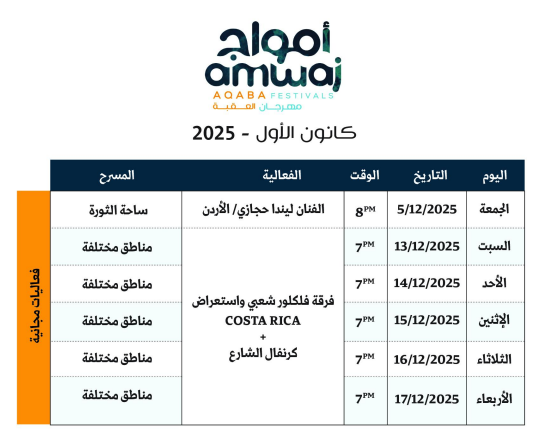 كشفت سلطة أقليم العقبة الاقتصادية الخاصة، عن تنظيمها بالتعاون مع مهرجان جرش للثقافة والفنون، لفعاليات "مهرجان أمواج العقبة"، وبدعم من هيئة تنشيط السياحة، اعتباراً من يوم الجمعة 13 كانون الأول الحالي، وويستمر طيلة العام 2025، في مواقع مختلفة من مدينة العقبة، تحت شعار "خليك ع نفس الموجة".