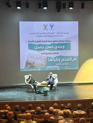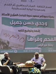 نظّم قسم الثقافة المركز الجماهيري - بلدية أم الفحم ومجموعة "الرواية" المنبثقة عن المركز الجماهيري أمسية ثقافية مميزة لإشهار وتوقيع كتاب “أم الفحم وقراها: رحلة عبر الزمن” للباحث والمؤرخ الأستاذ وجدي حسن جميل، وذلك بحضور لفيف من المثقفين والأكاديميين والمهتمين بتاريخ أم الفحم وهويتها.