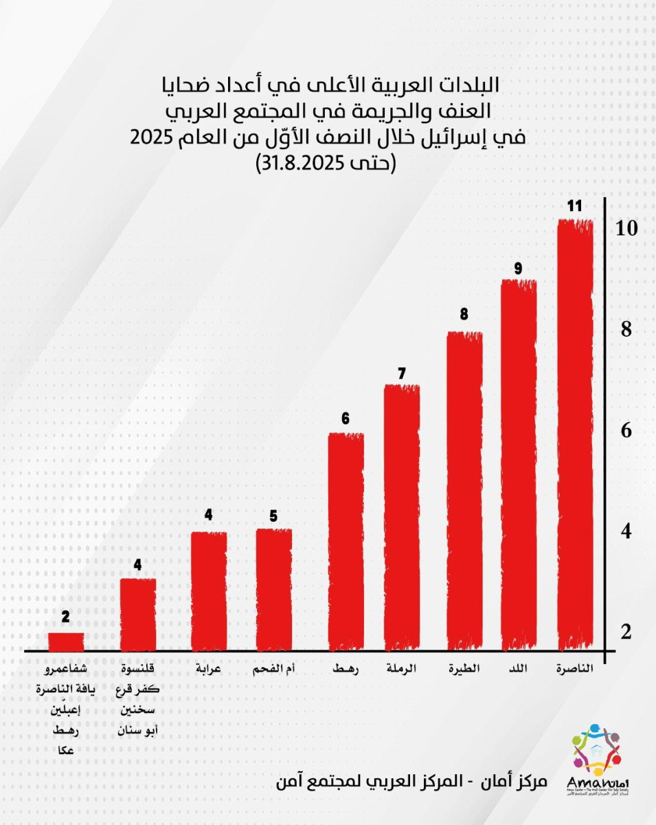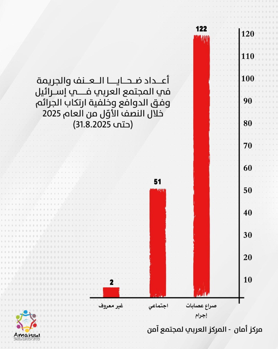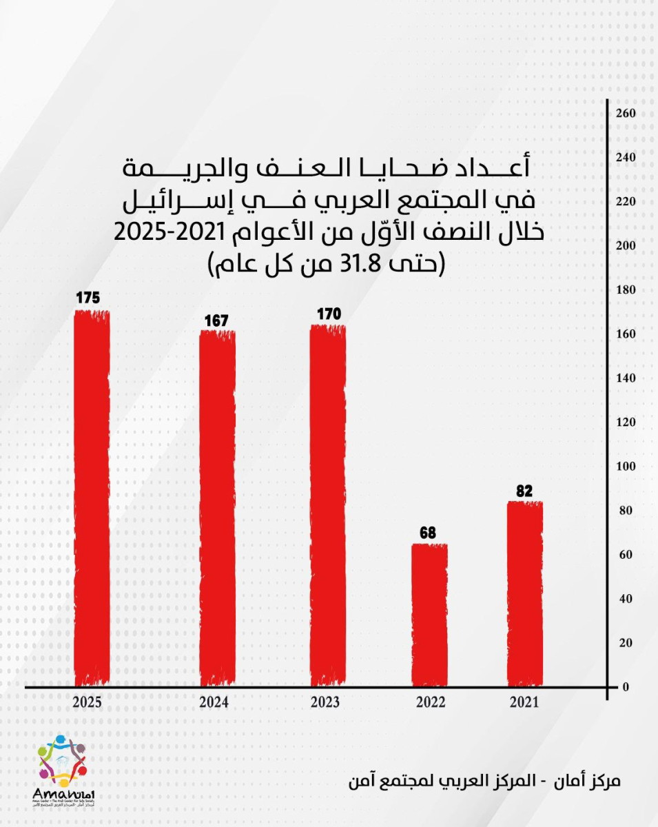 أصدر مركز أمان- المركز العربي لمجتمع آمن مساء الأحد (31 آب/أغسطس 2025) تقريره بعد مرور ثلثي العام، كاشفًا عن 175 ضحية من المجتمع العربي منذ مطلع العام، مقابل 167 في الفترة ذاتها من العام الماضي، و170 عام 2023، في قفزة حادة مقارنة بالسنوات 2021–2022 (82 و68 ضحية على التوالي).
