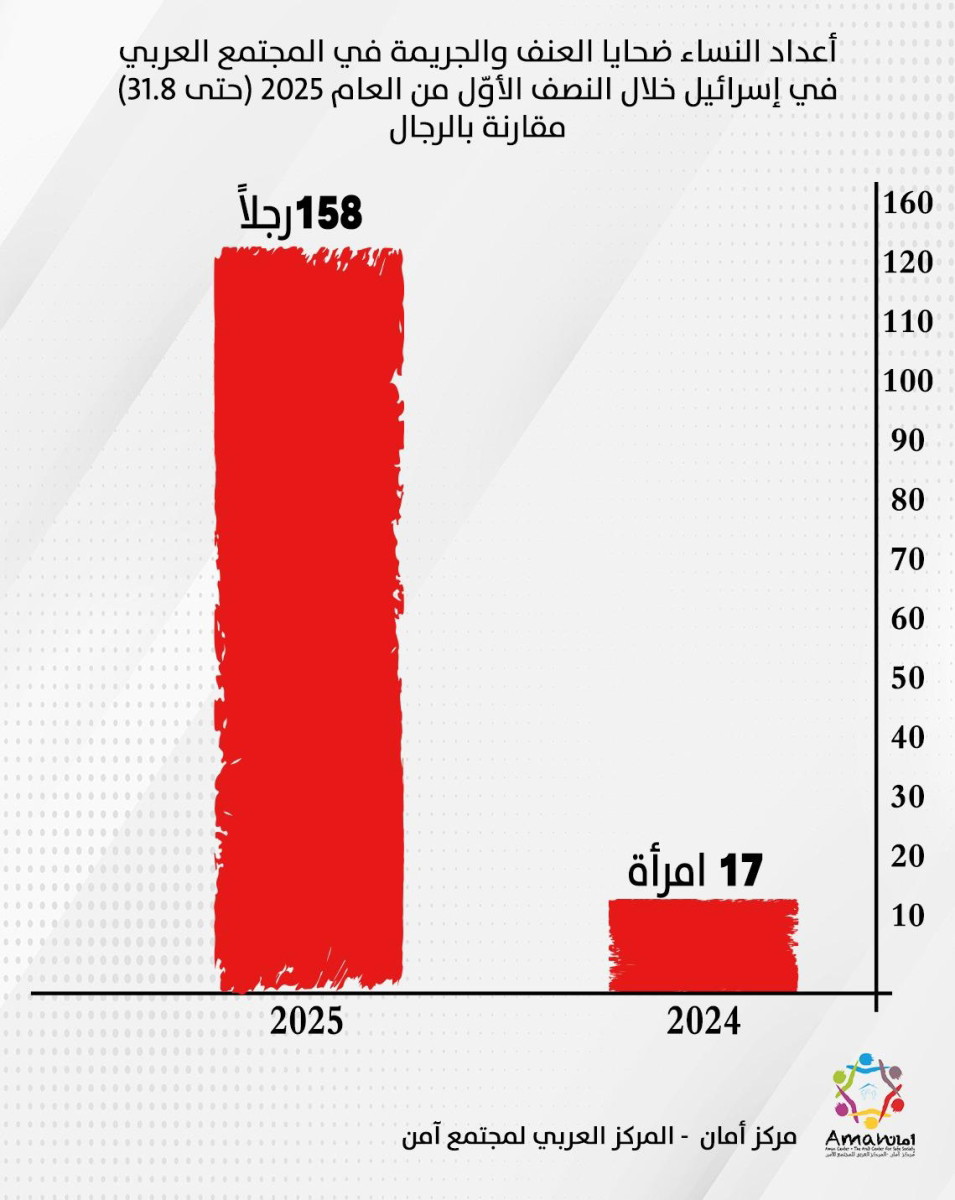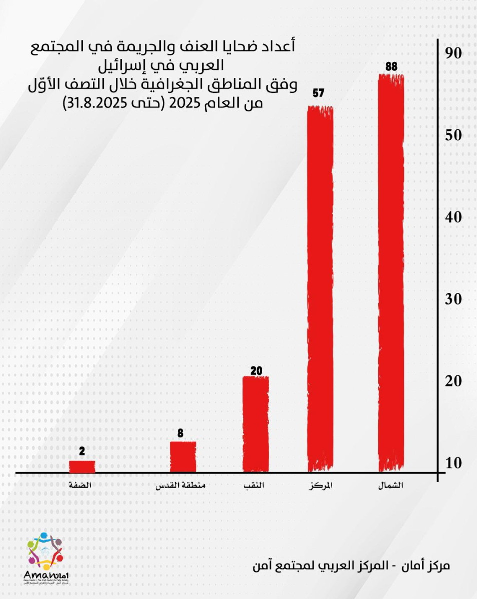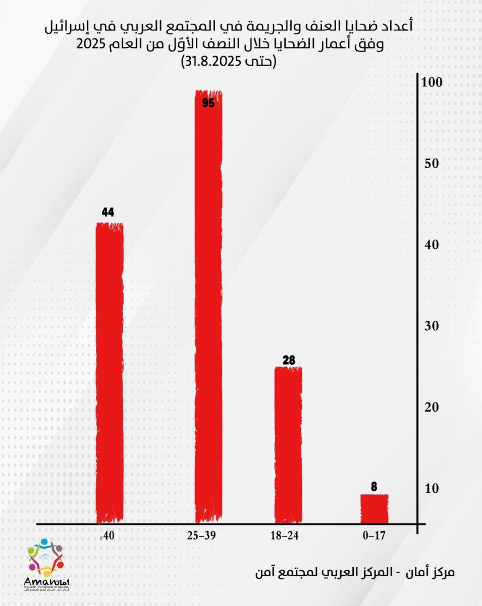 أصدر مركز أمان- المركز العربي لمجتمع آمن مساء الأحد (31 آب/أغسطس 2025) تقريره بعد مرور ثلثي العام، كاشفًا عن 175 ضحية من المجتمع العربي منذ مطلع العام، مقابل 167 في الفترة ذاتها من العام الماضي، و170 عام 2023، في قفزة حادة مقارنة بالسنوات 2021–2022 (82 و68 ضحية على التوالي).