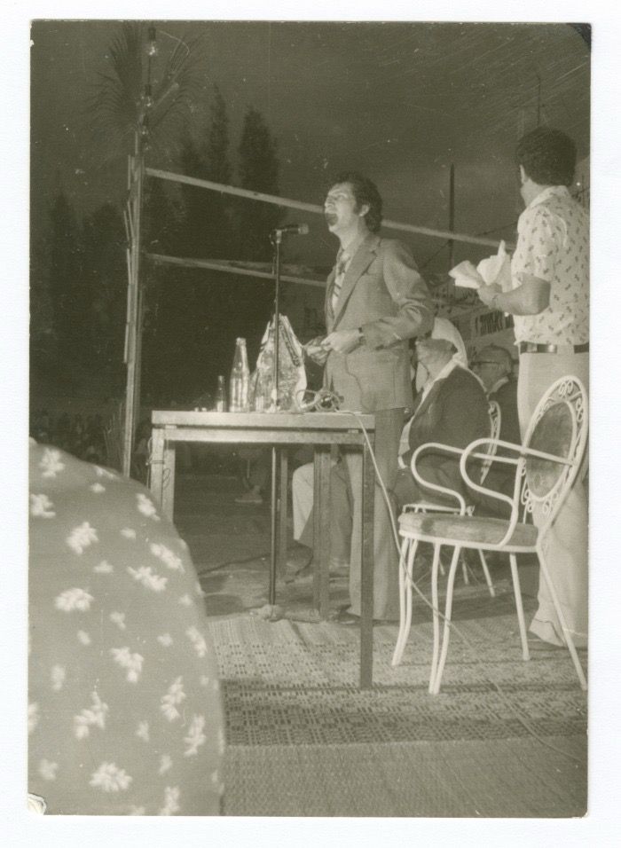 *في الصورة لقطة للشاعر و هو يلقي خطاباً في الذكرى العشرين لمجزرة كفر قاسم