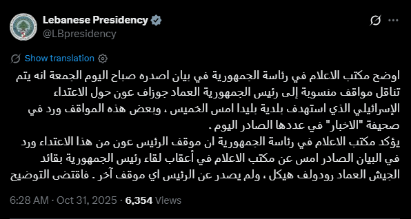 شددت رئاسة الجمهورية اللبنانية على أن موقف الرئيس جوزيف عون حول الاعتداء الإسرائيلي على بلدة بليدا صدر أمس عبر مكتب الإعلام في بيان ولم يصدر عنه أي موقف آخر.