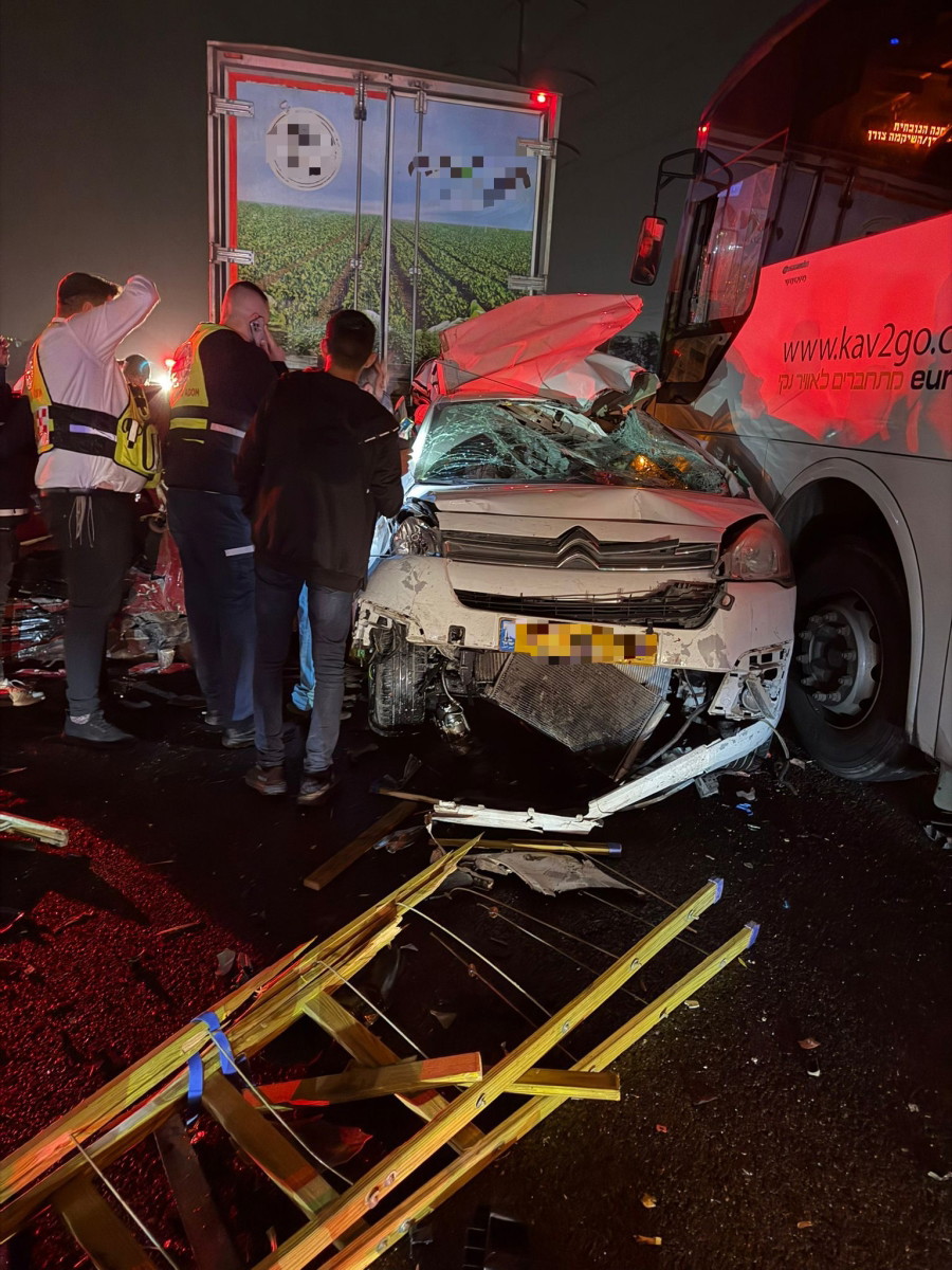 تفاصيل الحادث: وبحسب بيان "نجمة داود الحمراء"، وقع التصادم بين شاحنة، وحافلة ركاب، ومركبات خصوصية، حيث تحطمت المركبات الخصوصية وانحشرت بين الشاحنة والحافلة.